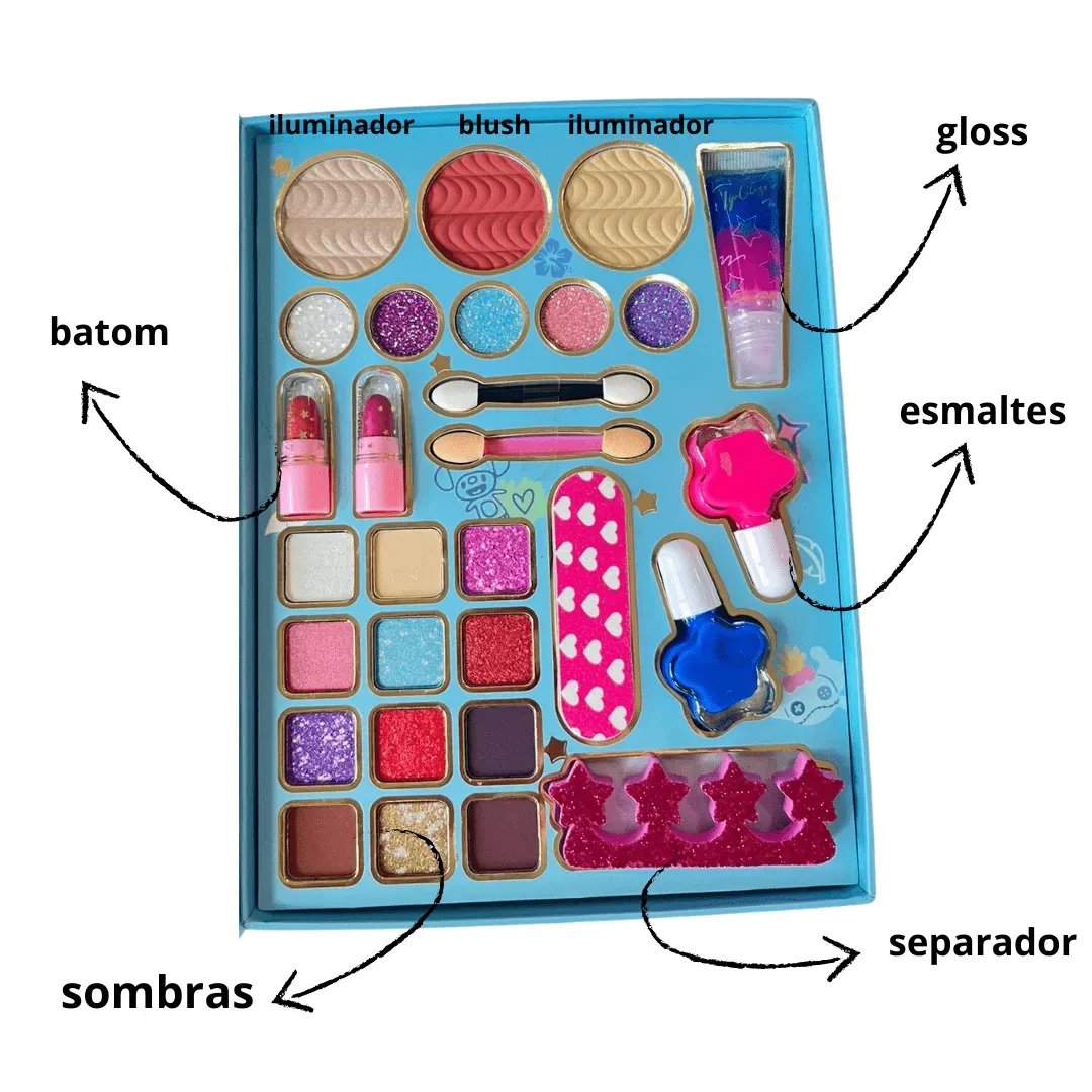 🎨 São cores vibrantes, brilhos encantadores e acessórios fofíssimos para transformar cada momento em uma verdadeira aventura de beleza! Tudo isso com produtos atóxicos, de fácil remoção e pensados especialmente para crianças! 🧼💖
