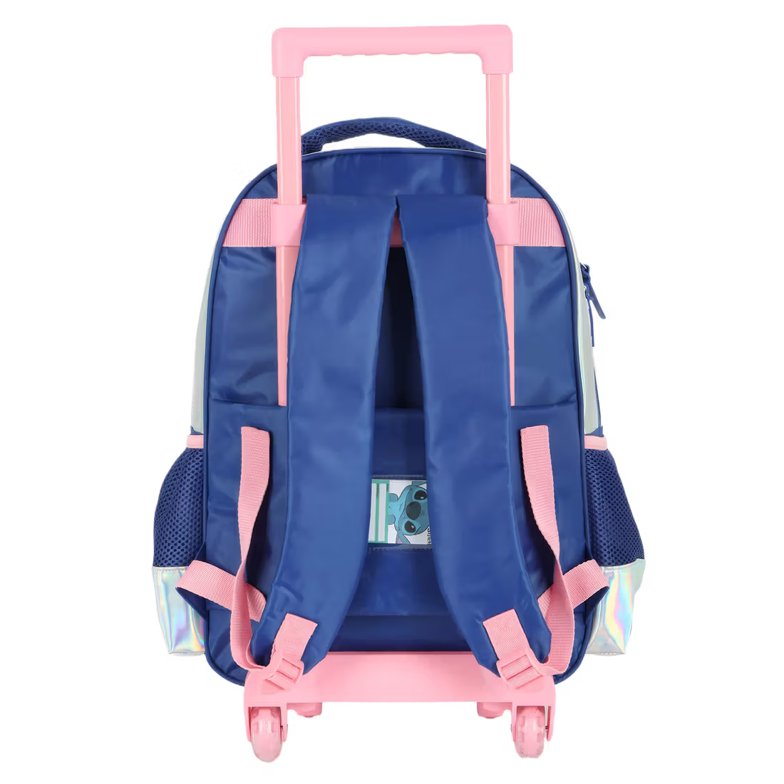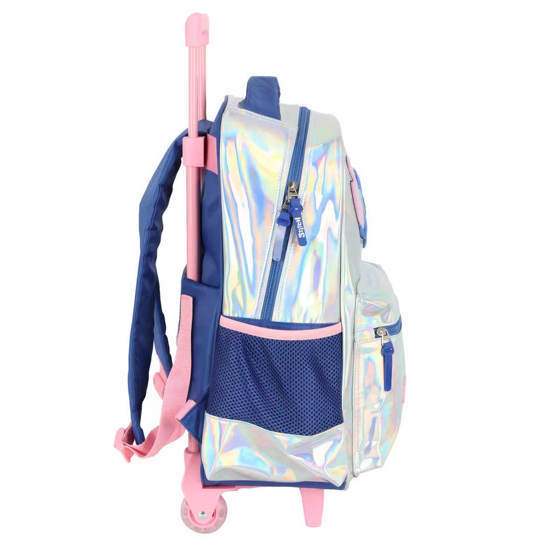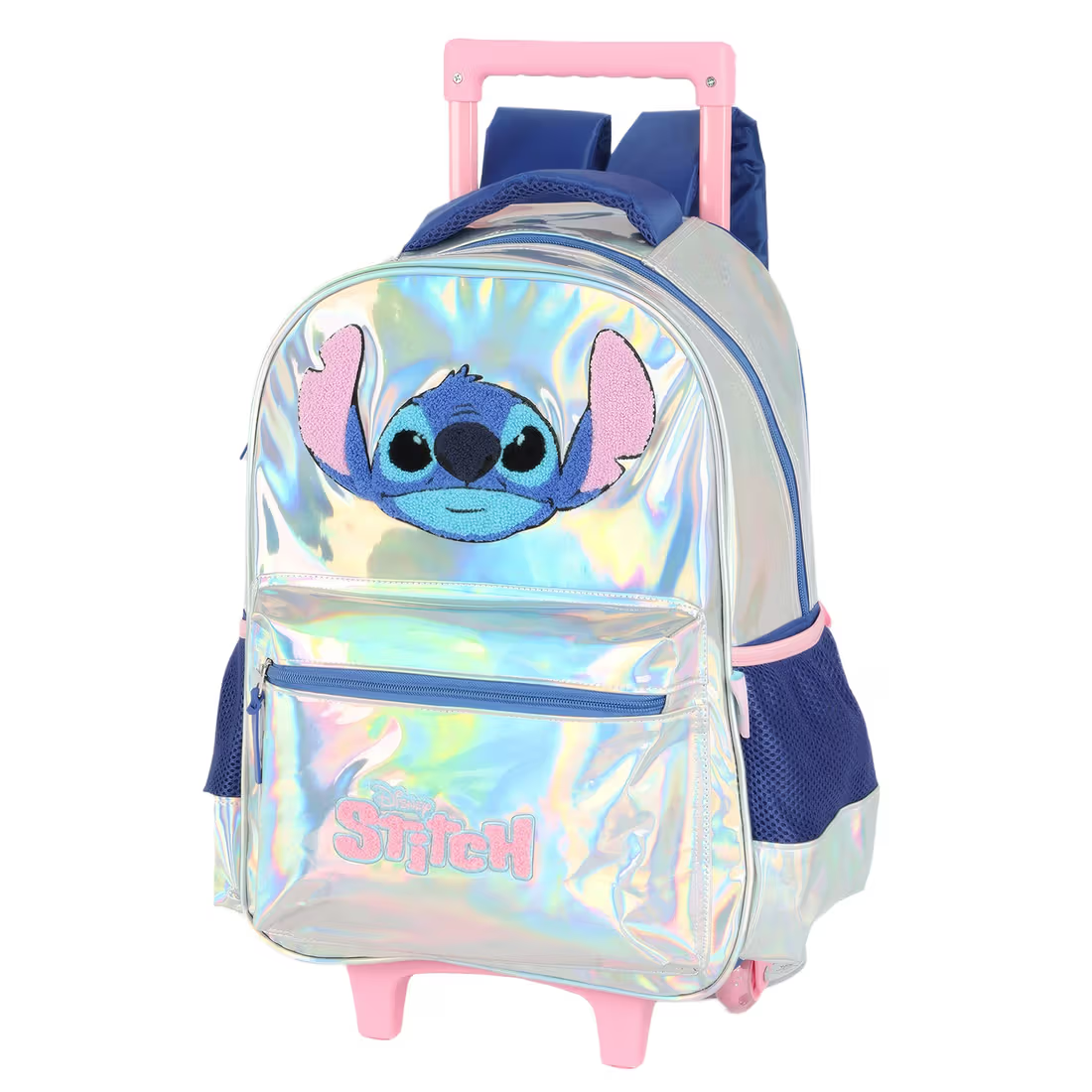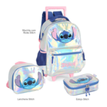 • Estilo Brilhante e Moderno: A Mochila com Rodinhas Stitch Holográfica combina o charme do efeito holográfico com a praticidade necessária para o dia a dia escolar.